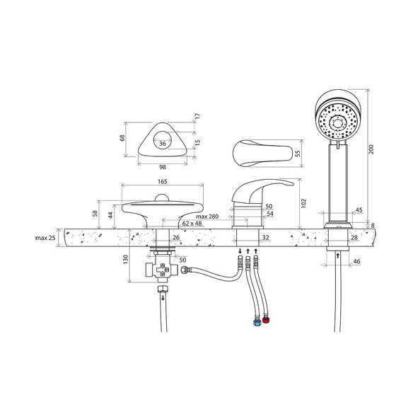 • Оснащение: крепления, душевая лейка, душевой шланг, дивертор